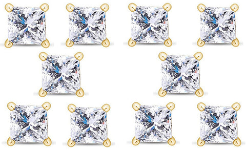 18k Yellow Gold Plated 1Ct Princess Cut White Sapphire Set Of Five Stud Earrings