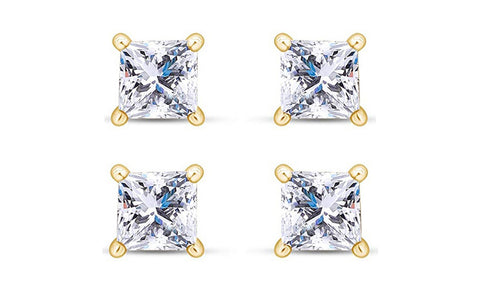 18k Yellow Gold Plated 1Ct Princess Cut White Sapphire Set Of Two Stud Earrings