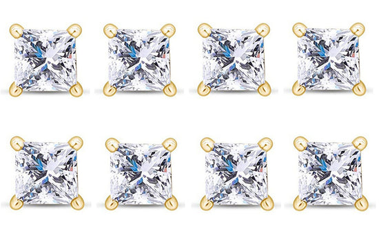 18k Yellow Gold Plated 2Ct Princess Cut White Sapphire Set Of Four Stud Earrings