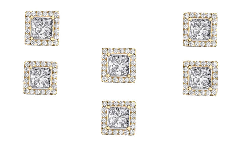 18k Yellow Gold Plated 6mm 4Ct Square Cut White Sapphire Set of Three Halo Stud Earrings