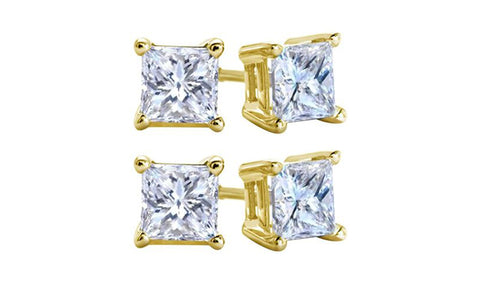18k Yellow Gold Plated Created White Sapphire 1 Carat Square Cut Pack of Two Stud Earrings