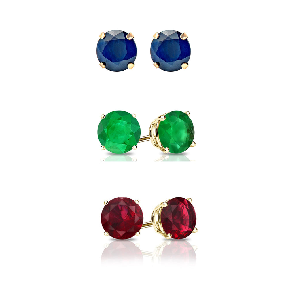 24k Yellow Gold Plated 1/2Ct Created Blue Sapphire, Emerald and Ruby 3 Pair Round Stud Earrings