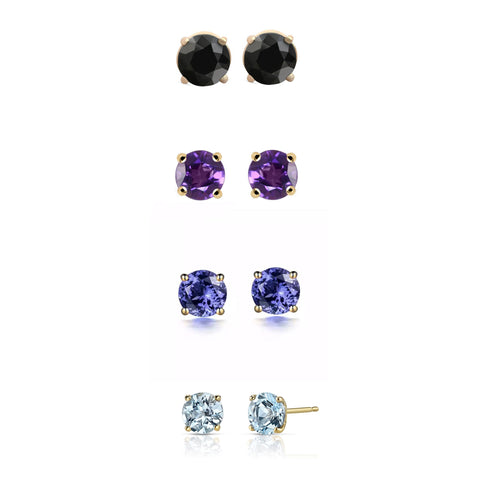 24k Yellow Gold Plated 1Ct Created Black Sapphire, Amethyst, Tanzanite and Aquamarine 4 Pair Round Stud Earrings